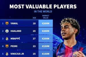 1-亚马尔(巴萨),18岁,2亿欧