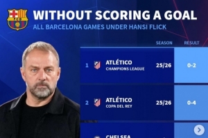 体育资讯4月9日讯 欧冠1/4决赛首回合比赛,巴萨主场0-2不敌马竞,据德国转会市场统计,弗里克执教巴萨以来仅5场比赛被零封,其中2场就是对阵马竞。