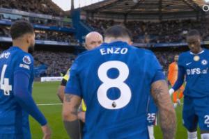 英超第30轮,切尔西vs纽卡,切尔西球员赛前围圈把主裁保罗·蒂尔尼围住,帕尔默抱裁判+盯着看。