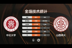 末节比赛,中北大学继续试投三分球,王嘉辉终于命中第二记远投,但这也是中北大学前四分钟的唯一进球,山西师大又一次完成反超,双方一直将比赛悬念打到最后,关键时刻范继昂和胡远航连续得分,李子超两罚全中,贾保成抢两分不中,最终中北大学66-64险胜山西师大迎开门红。